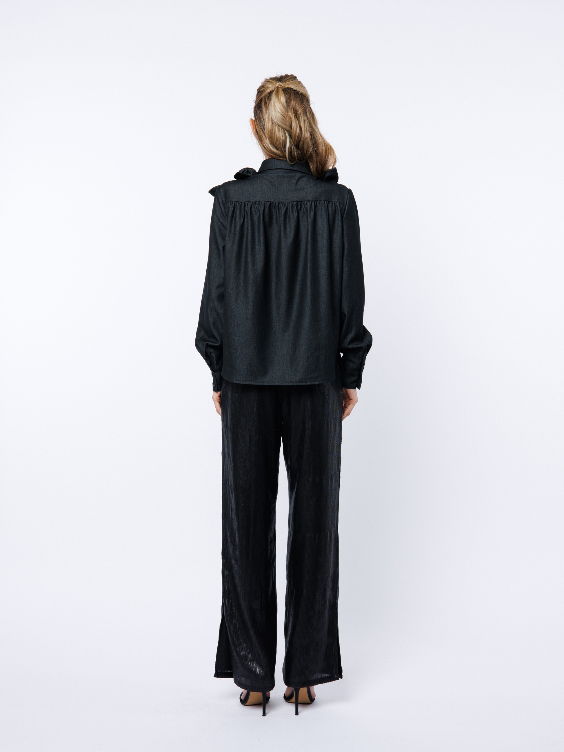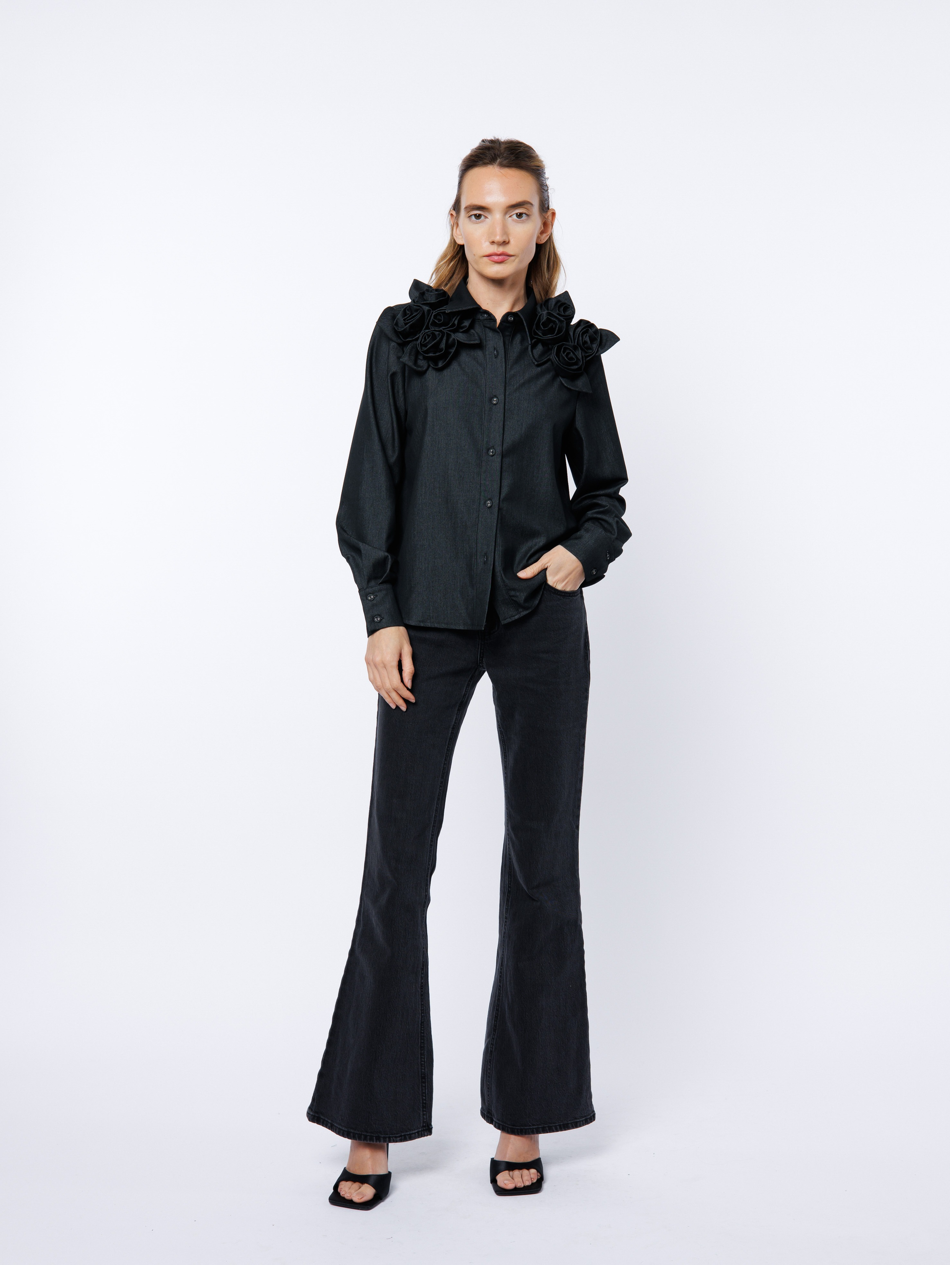Reimagine the classic denim shirt with this sophisticated dark-rinsed style, adorned with intricate 3D floral embroidery that brings dimension and visual interest to every wear. The romantic rosette detailing creates an unexpected elegance, while the expertly tailored cut provides a graceful drape that flatters the silhouette. Perfect for elevating casual moments or layering over essentials, this piece bridges the gap between timeless denim heritage and contemporary design sensibility..