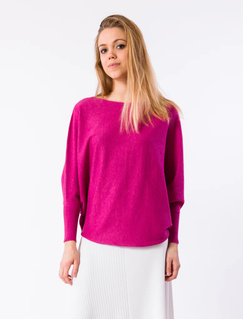 Boat neck top with 3/4 length dolman sleeves and curved sweep.