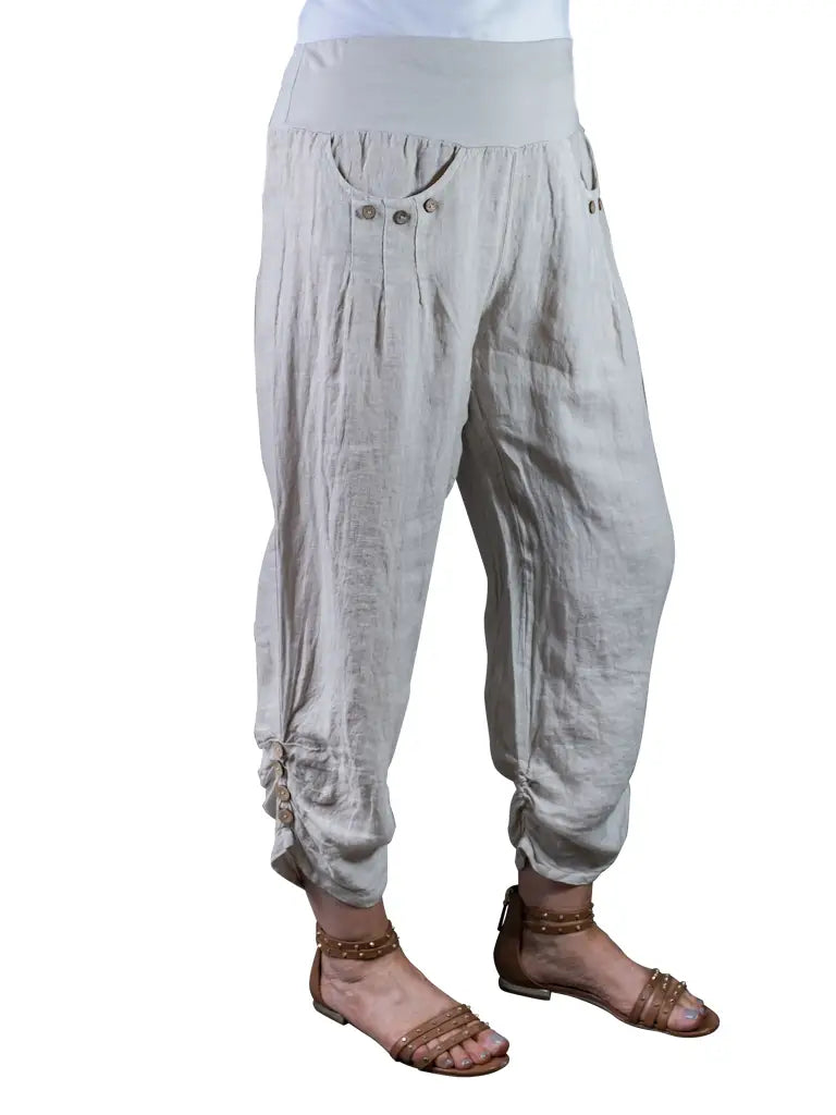 You’ll feel “Just Peachy” in the Georgia relaxed-fit, linen pants. Not too slim, not too full, these comfy pants are fashioned with an easy waistband for lifestyle comfort. The pretty ruched details at the ankle are adorned with faux wood buttons and again at the half-moon pockets. Made in Italy. • Easy stretch waistband • Ruched details at the ankle • Faux wood button decoration • Inseam approx 28" • One size fits most (REALLY!) *2 – 10/12 • Machine wash cold, delicate, with like colors. Lingerie bag recommended. Hang or lay flat to dry.