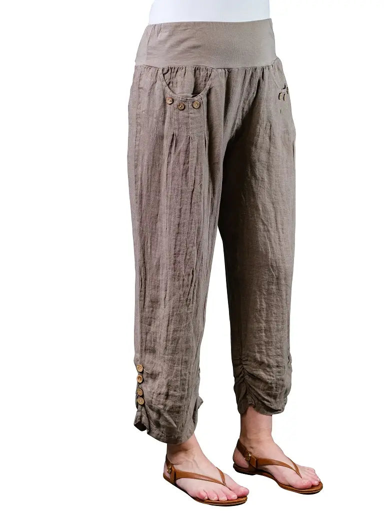 You’ll feel “Just Peachy” in the Georgia relaxed-fit, linen pants. Not too slim, not too full, these comfy pants are fashioned with an easy waistband for lifestyle comfort. The pretty ruched details at the ankle are adorned with faux wood buttons and again at the half-moon pockets. Made in Italy. • Easy stretch waistband • Ruched details at the ankle • Faux wood button decoration • Inseam approx 28" • One size fits most (REALLY!) *2 – 10/12 • Machine wash cold, delicate, with like colors. Lingerie bag recommended. Hang or lay flat to dry.