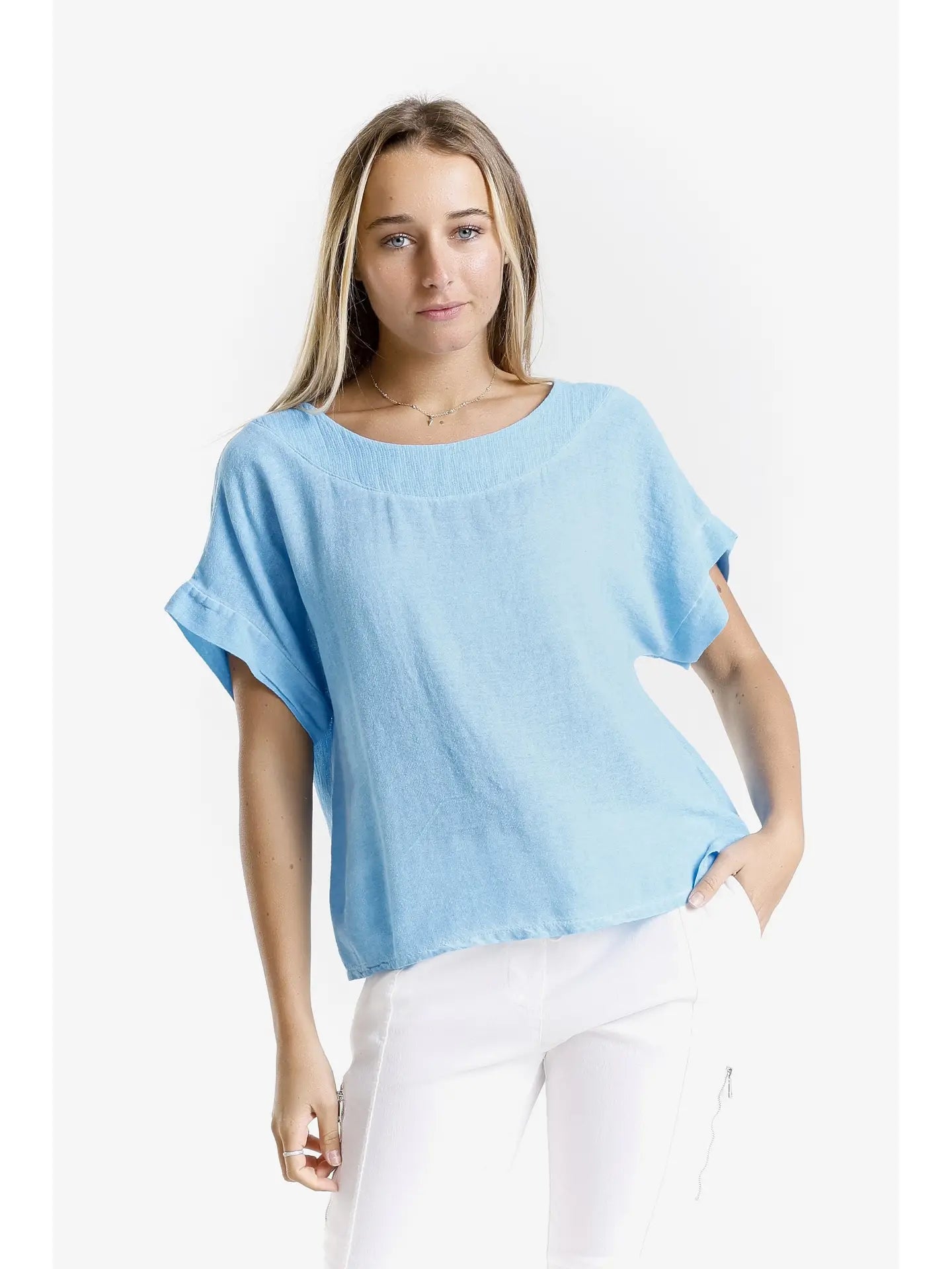 This top is a summer necessity! Lightweight and breezy, simple yet sophisticated. Gianna's linen-cotton feel and yoke neckline are perfect for warm and sunny days. With so many gorgeous colors, you'll need multiples in this staple! Made in Italy. • Yoke Neck • Short Sleeve • 50% Cotton, 50% Linen • One size fits most (REALLY!) *2 – 10/12 • Machine wash cold, delicate, with like colors. Lingerie bag recommended. Hang or lay flat to dry.