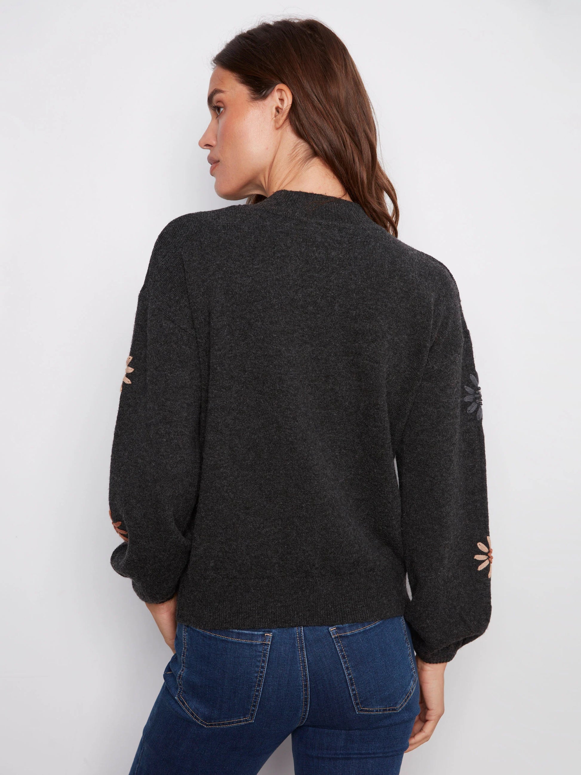 This heather charcoal gray sweater is a perfect addition to any fall wardrobe. The beautiful floral embroidery and mock neck provide a timeless yet contemporary look. Long sleeves with elastic cuffs add a subtle touch of sophistication. Perfect for layering or wearing on its own, it’s destined to become a favorite go-to piece.