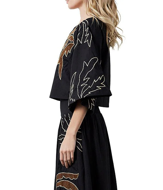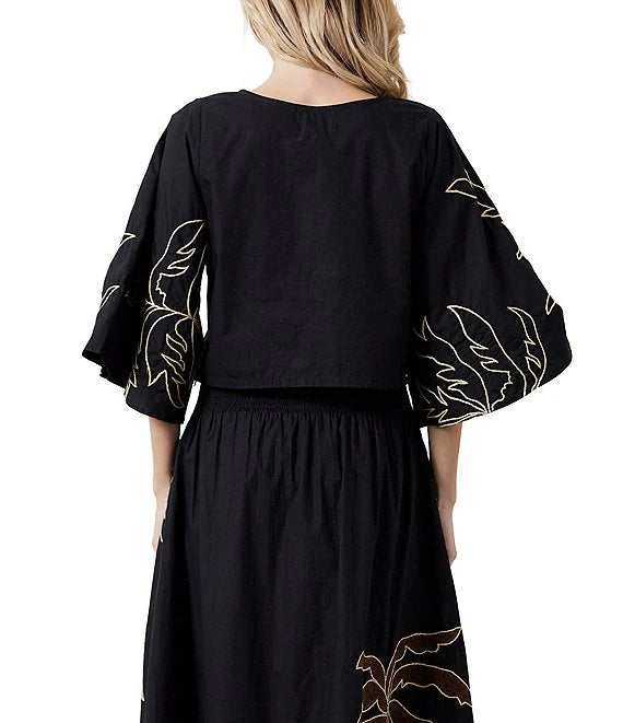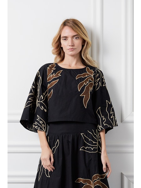 This cotton top showcases finely embroidered palm trees, bringing a refined tropical touch to your summer collection. With its bell sleeves and slightly cropped cut, it’s ideal for sunny outings. Crafted from breathable fabric and tailored with precision, it offers both comfort and sophistication.