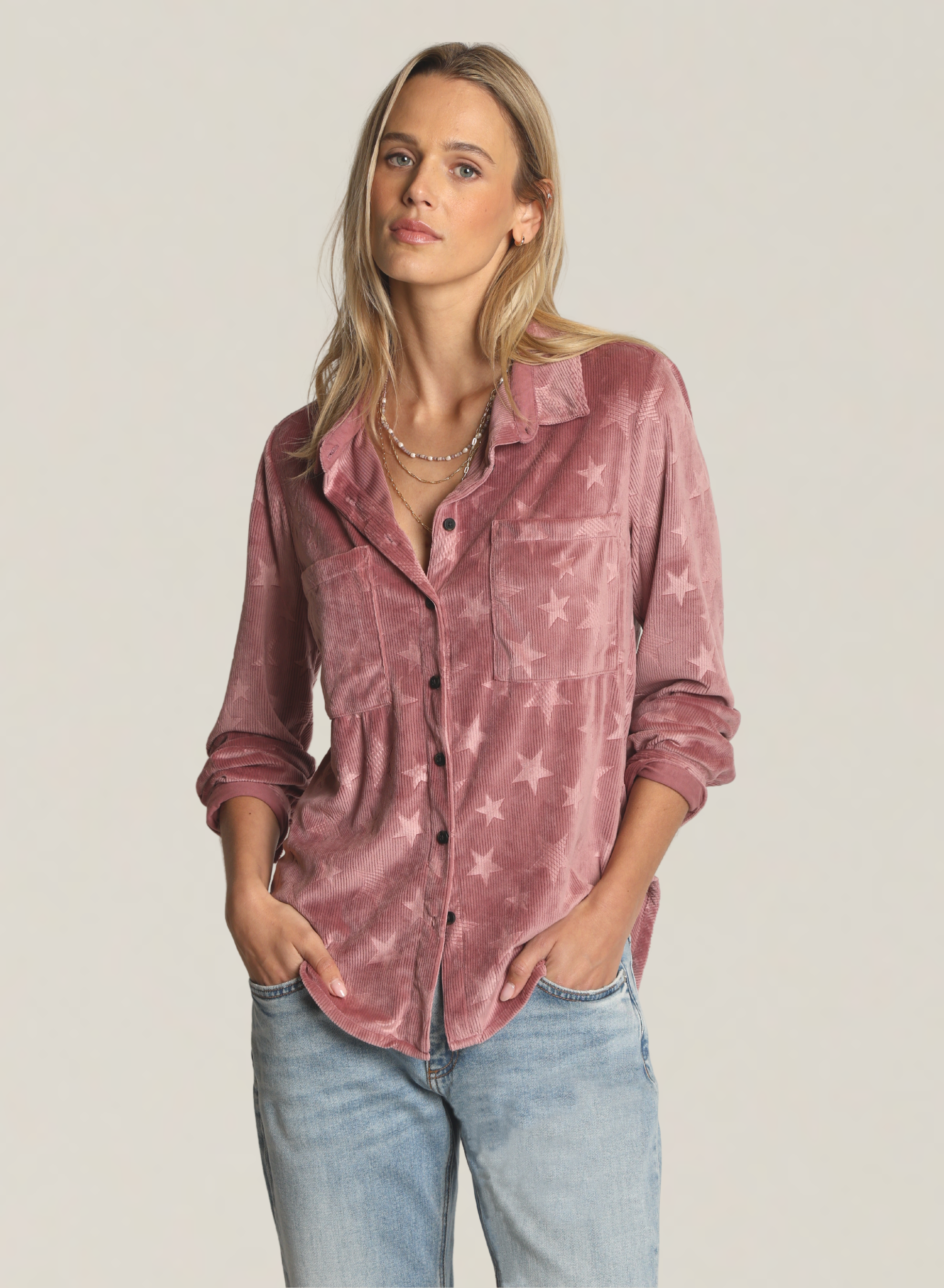 The Star Maeve Corduroy Shirt by Dylan combines comfort and style with its soft, stretchy fabric blend of 90% polyester and 10% spandex. Featuring a classic button-up design, subtle star details woven into the corduroy ribs add a unique touch. Two chest pockets provide practical storage, making this shirt a versatile, polished addition to your wardrobe.