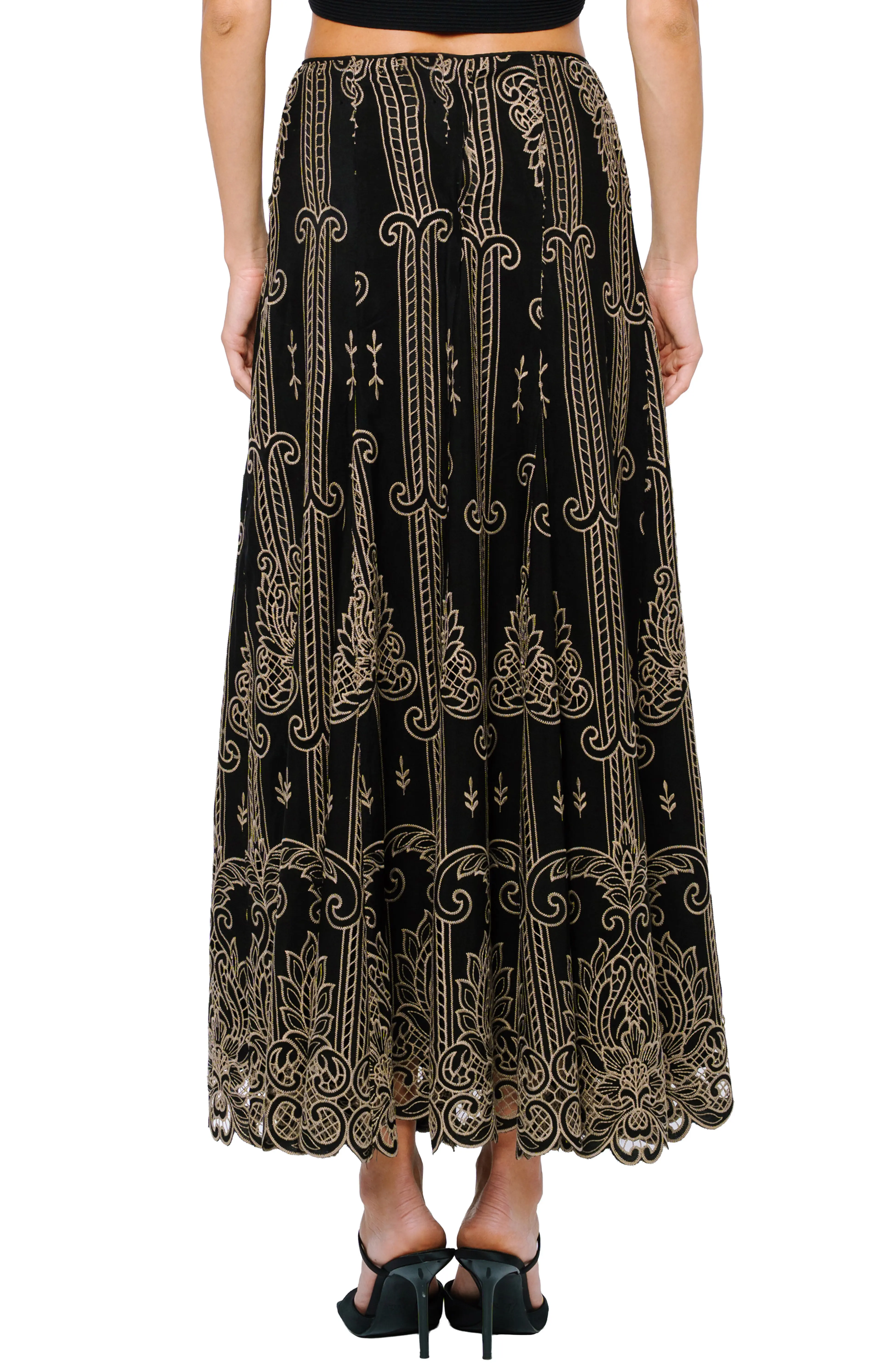 The Becca Lace Two-Tone Cutout Skirt features delicate cutouts along the hemline, creating an elegant lacy effect that highlights its intricate embroidery. This refined detail enhances the skirt's sophisticated design, making it a versatile piece suitable for elevating both casual and formal ensembles. Its craftsmanship ensures a graceful silhouette with a touch of distinctive texture and style.